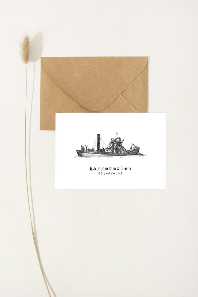 Gevouwen kaart met envelop of ansichtkaart zonder , tekening Baggermolen Sliedrecht.