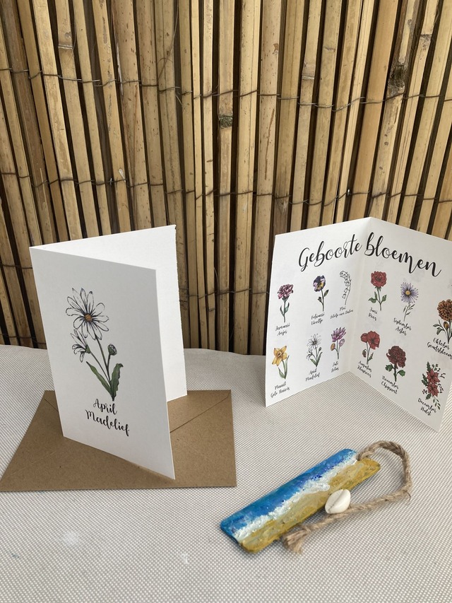 Ansichtkaart Geboortebloem April Madelief in kleur, inclusief envelop, van originele tekening, met of zonder tekst