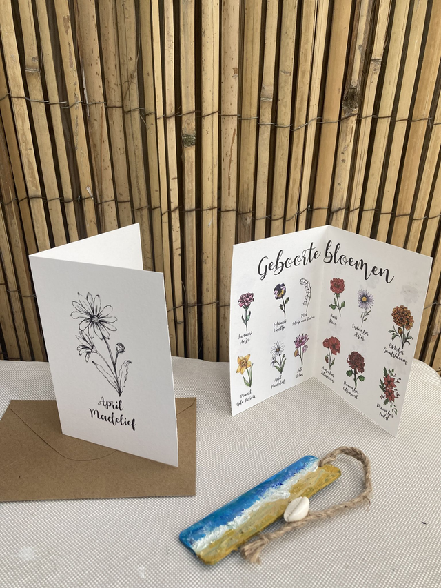 Ansichtkaart Geboortebloem April Madelief, inclusief envelop, van originele tekening, met of zonder tekst zwart wit. Zelf tekst kiezen ook mogelijk. Kies uit 3 opties.
