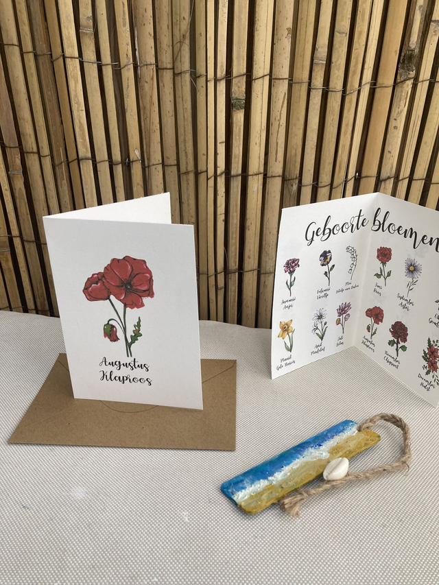 Ansichtkaart Geboortebloem Augustus Klaproos in kleur, inclusief envelop, van originele tekening, met of zonder tekst