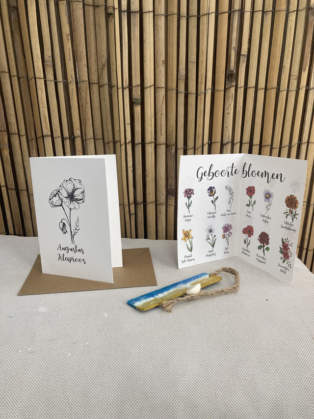 Ansichtkaart Geboortebloem Augustus Klaproos, inclusief envelop, van originele tekening, met of zonder tekst zwart wit. Zelf tekst kiezen ook mogelijk. Kies uit 3 opties.