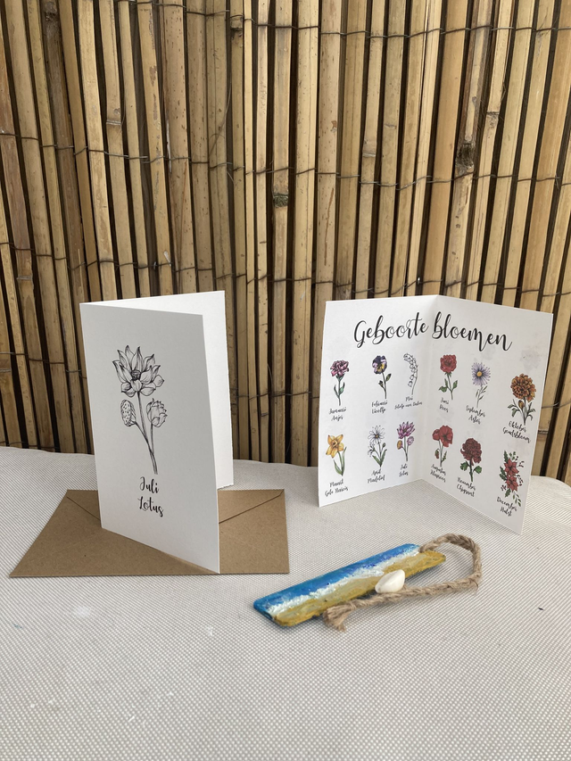 Ansichtkaart Geboortebloem Juli Lotus, inclusief envelop, van originele tekening, met of zonder tekst zwart wit. Zelf tekst kiezen ook mogelijk. Kies uit 3 opties.