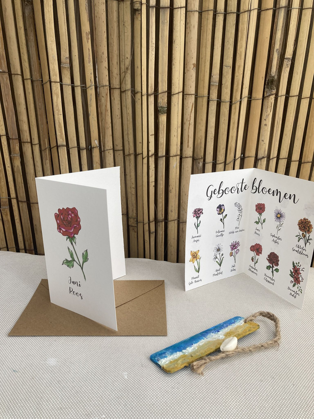 Ansichtkaart Geboortebloem Juni Roos in kleur, inclusief envelop, van originele tekening, met of zonder tekst