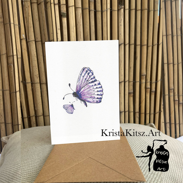 Ansichtkaart twee Vlinders, schilderkunst , inclusief envelop, van origineel schilderij. gevouwen met blanco binnenzijde, inclusief bruine craft envelop. Van een originele aquarel door Krista Kitsz.
