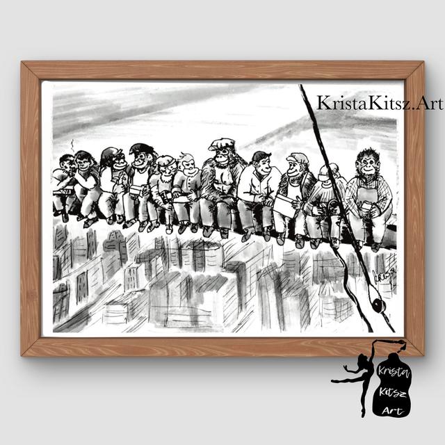 Apen Lunch Wolkenkrabber NY, luxe kunstprint op fine art papier . Mooie tekenkunst om in te lijsten. Origineel getekend door Krista Kitsz. Deze minimalistische muurkunst is verkrijgbaar in drie verschillende afmetingen;