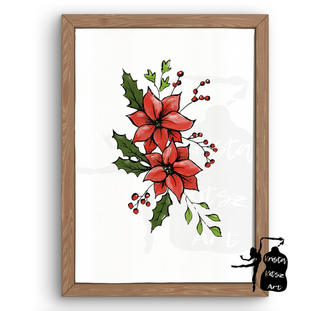 Geboortebloem December Hulst in kleur , luxe kunstprint op fine art papier van originele tekening, met of zonder tekst. Mooie tekenkunst om in te lijsten. Origineel getekend door Krista Kitsz.