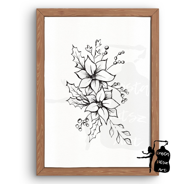 Geboortebloem December Hulst in zwart wit , luxe kunstprint op fine art papier van originele tekening, met of zonder tekst. Mooie tekenkunst om in te lijsten. Origineel getekend door Krista Kitsz.