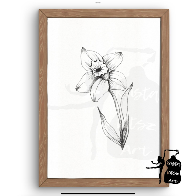 Geboortebloem Maart Narcis in zwart wit , luxe kunstprint op fine art papier van originele tekening, met of zonder tekst. Mooie tekenkunst om in te lijsten. Origineel getekend door Krista Kitsz.