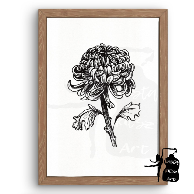 Geboortebloem November Chrysant in zwart wit , luxe kunstprint op fine art papier van originele tekening, met of zonder tekst. Mooie tekenkunst om in te lijsten. Origineel getekend door Krista Kitsz.