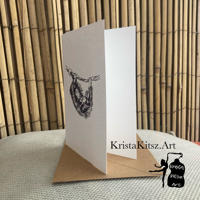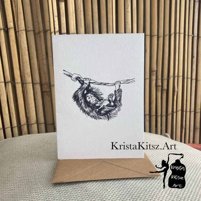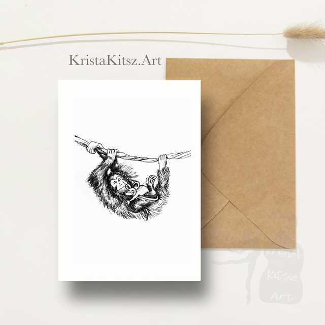 Gevouwen Ansichtkaart Aapje en Muis vriendjes, inclusief envelop, gevouwen met blanco binnenzijde, inclusief bruine craft envelop. tekening door Krista Kitsz.