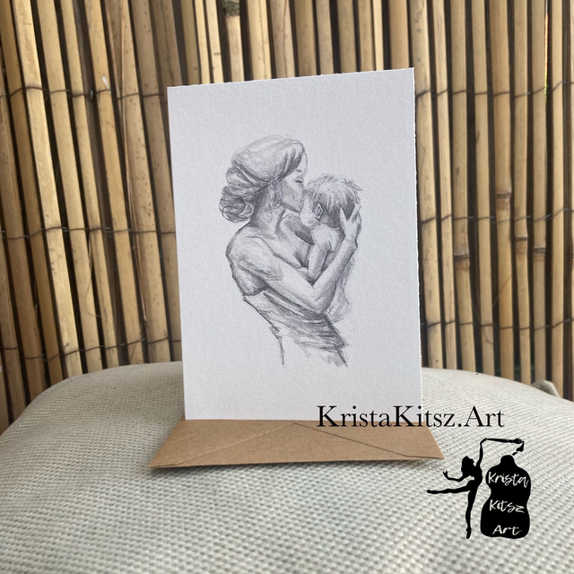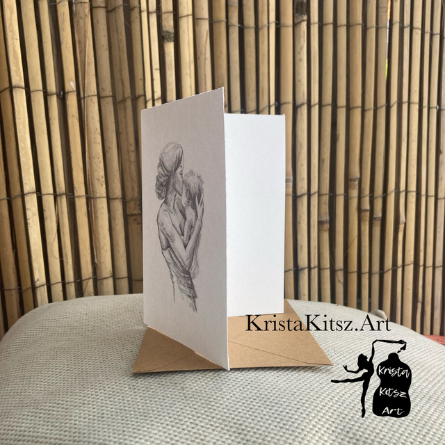 Een kaartje om in te lijsten! Ansichtkaart gevouwen met blanco binnenzijde, inclusief bruine craft envelop. Moeder en kind. Van een originele potlood tekening door Krista Kitsz.