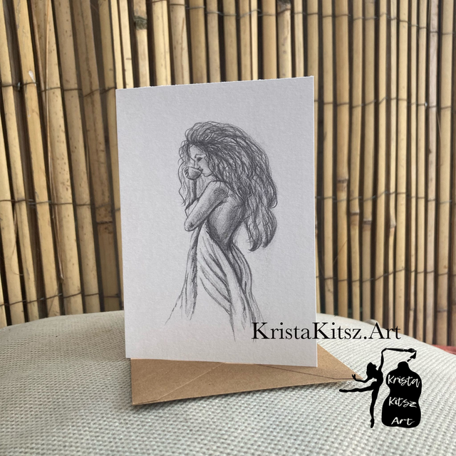 Gevouwen Ansichtkaart Vrouw koffie tekening, inclusief envelop, gevouwen met blanco binnenzijde, inclusief bruine craft envelop. Van een originele tekening door Krista Kitsz.