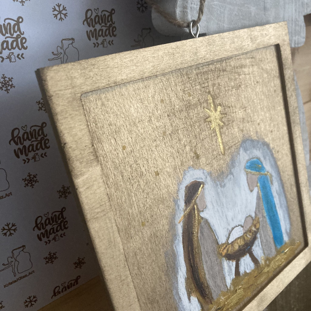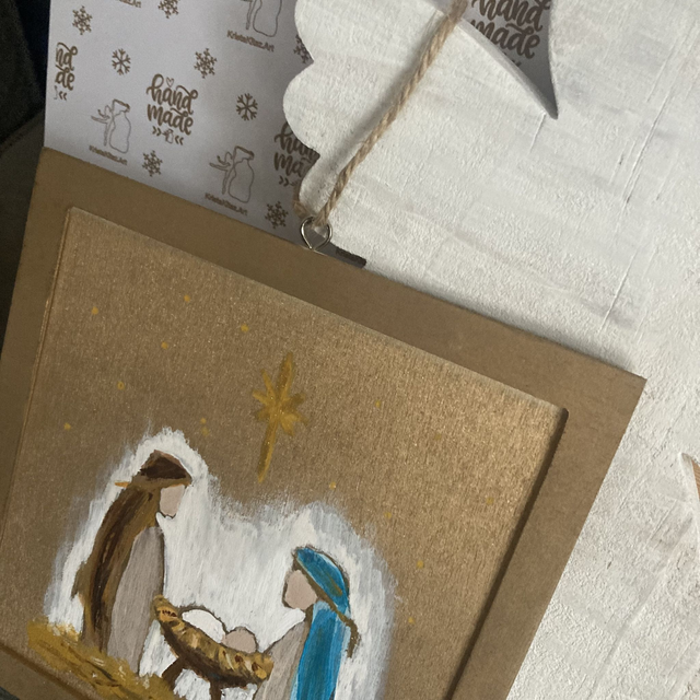 Kerststal | klein schilderij op hout, goudkleurig | handbeschilderd | om op te hangen | jute koordje | kerst