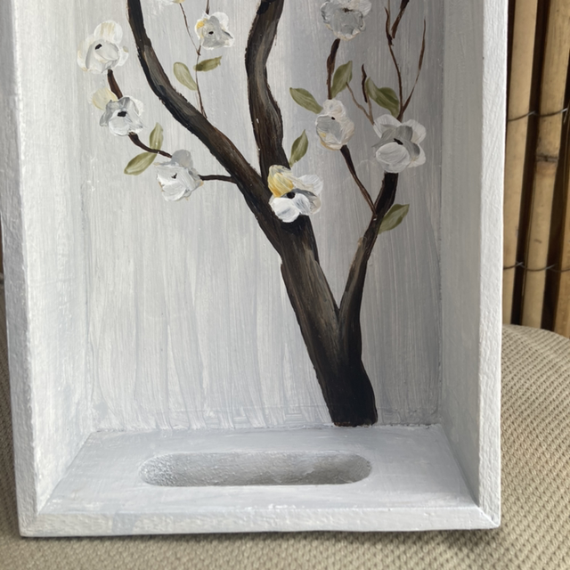 Het kale houten dienblad heb ik eerst voorzichtig opgeschuurd. Daarna behandeld met een voedende olie voor het hout. Zo gaat het materiaal langer mee. Vervolgens heb ik mijn schilderij gemaakt, met museum kwaliteit acryl verf, na de verflagen heb ik nog een transparante licht glanzende coating aangebracht zodat de schildering mooi blijft.