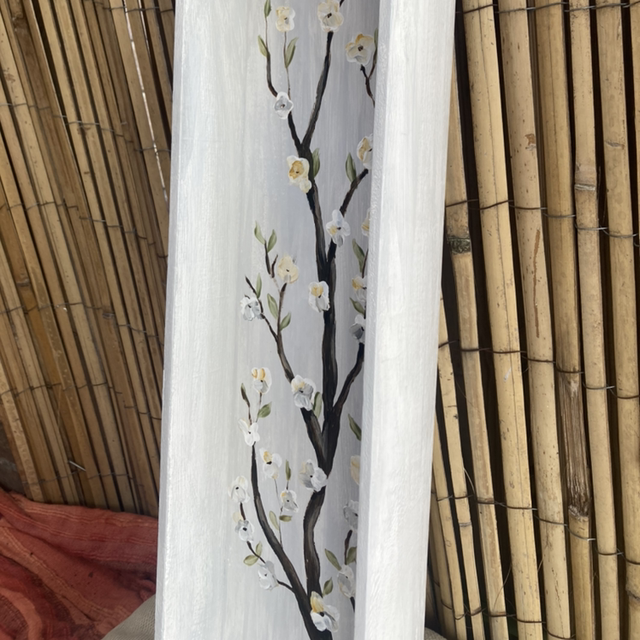 Kunst op hout, handbeschilderd decoratief dienblad, bloemen , rechthoekig 49 x 14cm , grijs wit groen bruin, Krista Kitsz Art