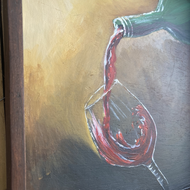 Handgeschilderd decoratief dienblad, glas wijn en fles, vierkant bruin rood groen. Kunst op hout.