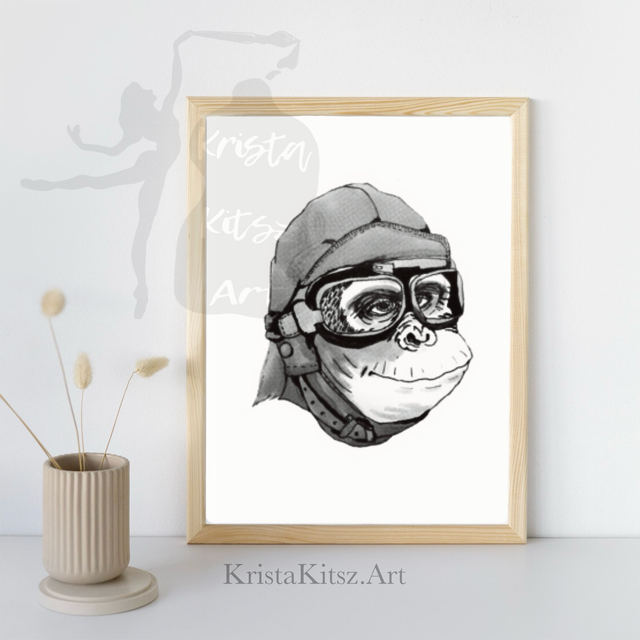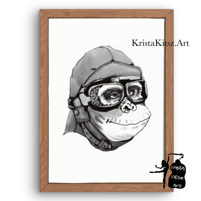 Leuke print Aapje Piloot , inkt pen tekening apenkunst van Krista Kitsz.