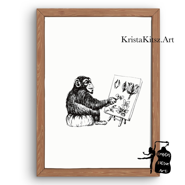 Leuke print Aapje schildert , tekening met inkt pen. Apenkunst van Krista Kitsz