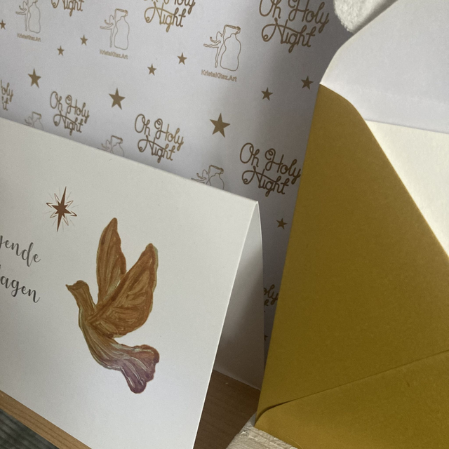 Luxe Christelijke Kerstkaart Gezegende Kerstdagen Duif | dubbele ansichtkaart met goudkleurige envelop. Goud en zilverkleurige tekst en tekening van engelen vleugels.