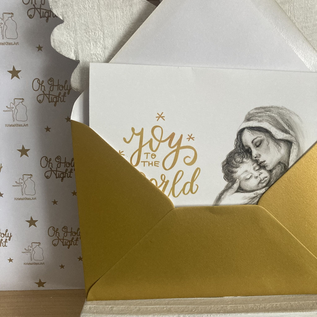 Luxe Christelijke Kerstkaart Joy to the World Maria en baby Jezus | postkaart zonder of dubbele ansichtkaart met goudkleurige envelop. Goud en zilverkleurige tekst en tekening van engelen vleugels.