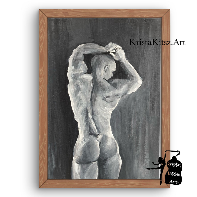 Mannelijk naakt rugaanzicht, schilderij, luxe kunstprint op aquarel papier met structuur zwart wit grijs. Origineel geschilderd door Krista Kitsz. Deze muurkunst is verkrijgbaar in drie verschillende afmetingen;