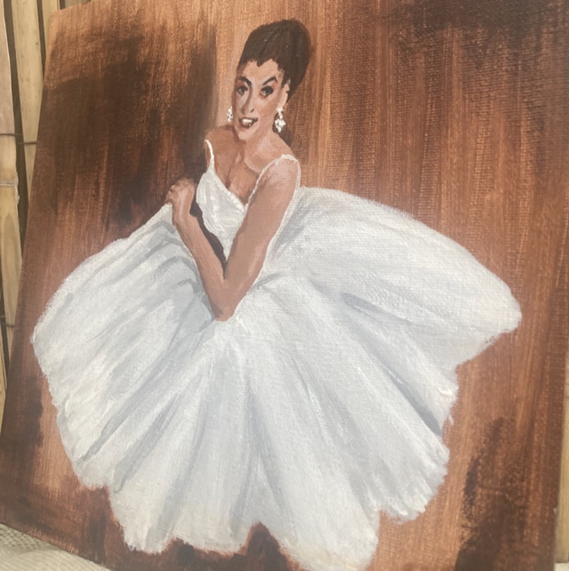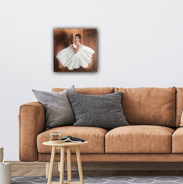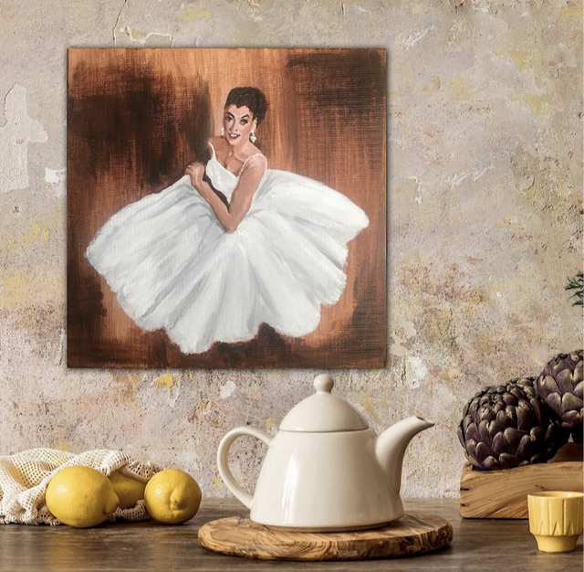 Handgeschilderd vierkant schilderij Dame in grote witte bal jurk, op een bruin rustieke achtergrond, origineel op plat canvas board.