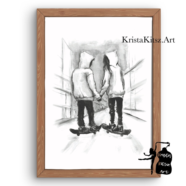 Skate stel samen in de stad, mooie zwart wit poster print van aquarel
