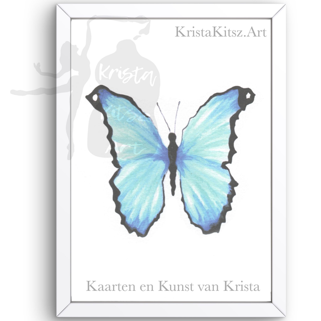 Vlinder Blauw, luxe kunstprint op aquarel papier met structuur. Mooie schilderkunst om in te lijsten.