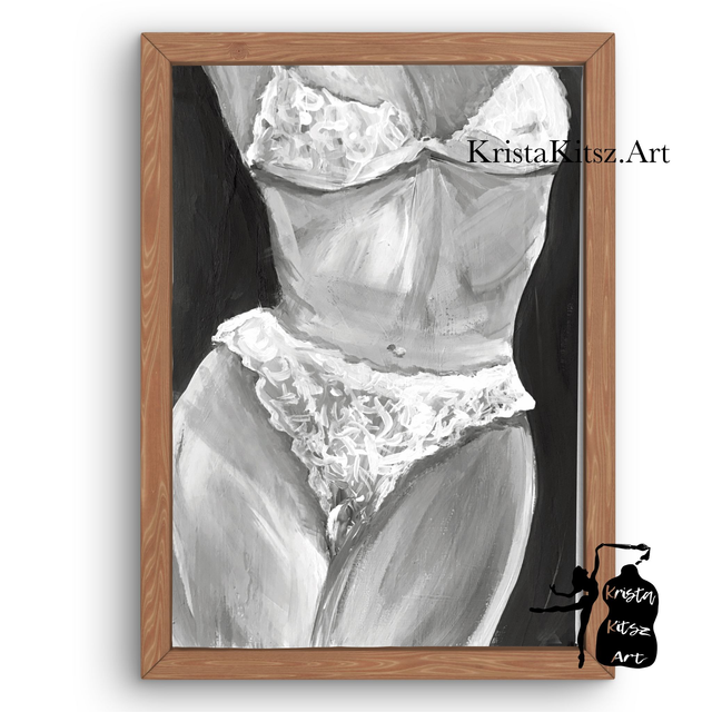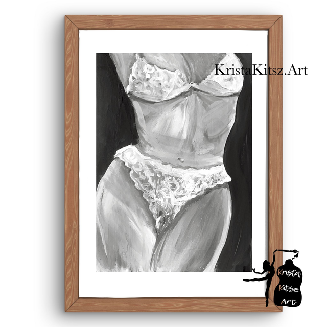 Vrouw in lingerie lichaam , prachtige zwart wit print van schilderij, krista kitsz art